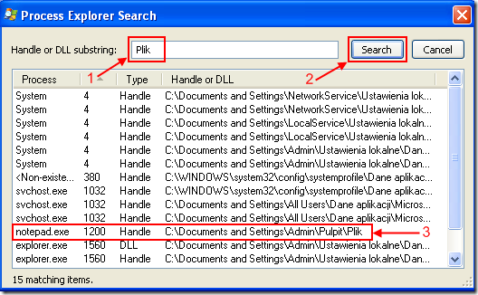 - W nowo otwartym oknie wpisujemy nazwę szukanego pliku (1) lub katalogu, klikamy Search (2) i w liście wyszukujemy proces, który wykorzystuje nasz plik lub jeden z plików w naszym folderze (3).
